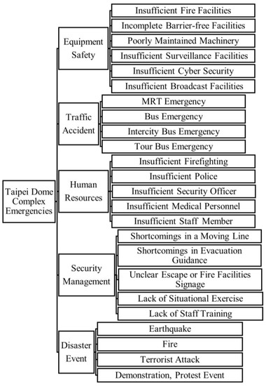 We explore risk factors for disasters and safety events through the analysis of potential disasters, relevant paper references, and cases of terrorist attacks in the arena. The key factors affecting the security of the Taipei Dome Complex are summarized into five aspects: equipment safety, traffic accidents, human resources, security management, and disaster event. The security risk factor structure is shown in Figure 4. Equipment safety includes insufficient fire facilities, incomplete barrier-free facilities, poorly maintained machinery, insufficient surveillance facilities, and insufficient cyber security. Traffic accident includes MRT emergencies, bus emergencies, intercity bus emergencies, and tour bus emergencies tha5t affect the crowd in the complex. Human resources includes insufficient firefighting, insufficient police, insufficient security officer, insufficient medical personnel, and insufficient staff member. The security management includes shortcomings in a moving line, shortcomings in evacuation guidance, unclear escape or fire facilities signage, lack of situational exercise, and lack of staff training. The disaster event includes earthquake, fire terrorist attack, and demonstration/protest event.
