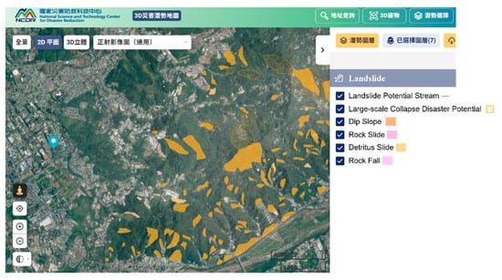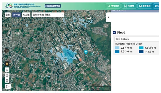 We use the FEMA disaster analysis table for fires, landslides, floods, and earthquakes. The analysis result shows that earthquakes are most likely to be large-scale disasters, and fire is low. As shown in Table 1, floods and landslides have obvious cycles, and prevention work can be prepared in advance. The impact time is short, and the impact of serial consequences is not significant. Using the flooding simulation of the National Disaster Prevention and Rescue Technology Center, as shown in Figure 1, the potential flooding area with 300 mm in 12 h is not located near the Taipei Prison. The landslide simulation shows that none of the Taipei prisons are affected (Figure 2).