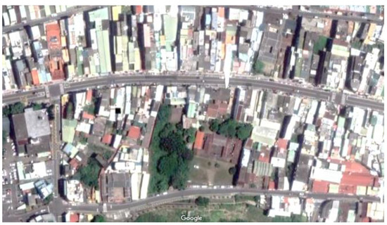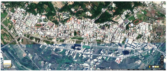Topography of the vernacular settlement of Xinpu. Source: Google Map, https://www.google.com.tw/maps/@24.8272863,121.0759617,1459m/data=!3m1!1e3?hl=zh-TW&entry=ttu. (accessed on 2 October 2022).