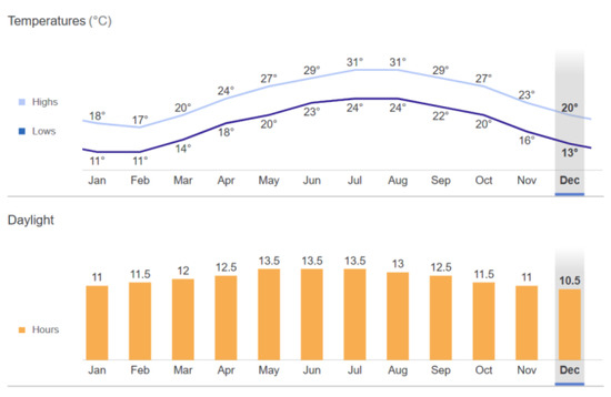 Monthly values of temperature and daylight hours. Sourse: Weather and Climate, https://weather-and-climate.com/average-monthly-Rainfall-Temperature-Sunshine,hsinchu-city-hsinchu-county-tw,Taiwan (accessed on 5 May 2022).