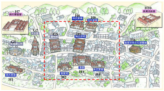 Three Streets, Six Lanes, and Nine Ancestral Halls in Xinpu. Source: Xinpu Ancestral Museum Promotion Association, http://210.63.200.70/exhib.asp. (accessed on 2 October 2022) (G1: Xinpu Town Office (新埔鎮公所); G2: Cathedral (天主堂); G3: Guanghe Temple (廣和宮); H1: Chang Family Hall (張氏家廟); H2: Liu Family Hall (劉家祠); H3: Peng Family Hall (潘屋); H4: Chu Family Hall (朱氏家廟); H5: Chen Family Hall (陳氏宗祠); H6: Hakka Culture Guide Hall (客家宗祠文化導覽館); H7: Liu Family Twin Hall (劉氏雙堂屋); H8: Lin Family Hall (林氏家廟); H9: Fan Family Hall (范氏家廟); H10: Wu’s former residence (吳濁流故居); The red dotted line marking the location of the core testing area (shown in Figure 4)).