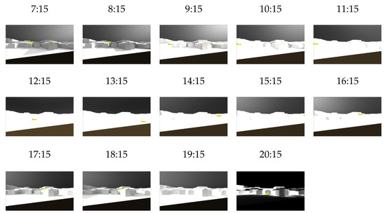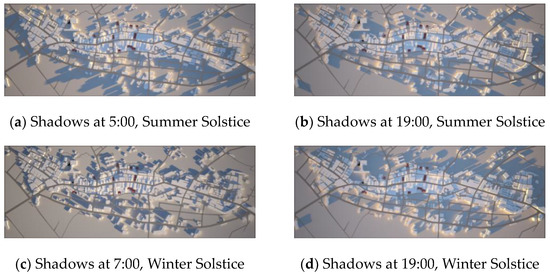 Using Ecotect software, the shading conditions of the environment of Xinpu settlements were analyzed, and a later rendering was carried out. The three-dimensional model was drawn and tested for the summer solstice (22 June) (Figure 5a,b), the winter solstice (22 December) (Figure 5c,d), and the spring/autumn equinox at representative hours of the day.