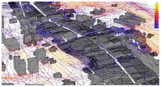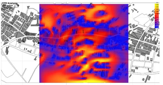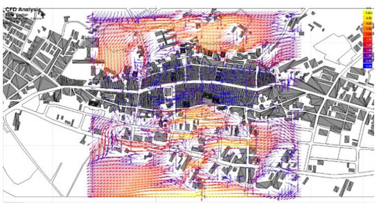 The wind flow in the town is interesting. The east–west slope on the north side blocks the famous ‘Nine-Falling Wind.’ However, the gentle slope on the south side and the open stream on the east side allow the northeast monsoon in September to blow on the old streets of Xinpu. Figure 9 and Figure 10 show the period when the Nine-Falling Wind prevails with the change in building volume. The flow and distribution of the air change drastically and in an instant. The change in wind direction is observed from the vector diagram (Figure 11). The simulation and analysis of the wind field are carried out with Cardiff University’s WinAir4, and the visual performance is controlled with Ecotect Analysis. The disadvantage of WinAir4 is the limitation of the number of grids, and its three-dimensional proportions cannot be completely consistent. Therefore, the estimated results can only be used as a preliminary reference. However, it has the advantage of ease of use and free use for research purposes.