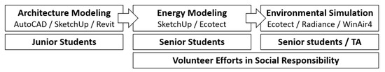 The USR Project is provided for student learning. Therefore, we designed a learning road map (Figure 12) based on a physical environmental analysis [5]. Software including AutoCAD 2D drafting, SketchUp 3D modeling, Revit modeling, Ecotect Analysis, Desktop Radiance, and the CFD of WinAir4 was used.