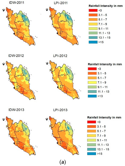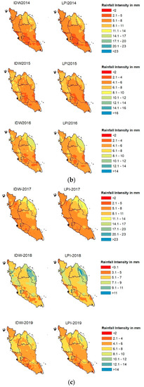 This section compares the spatial interpolation results using IDW and LPI with the ground-based rainfall data on an annual scale. Both IDW and LPI interpolation results are shown in their graphical form (Figure 1). Additionally, the performance of IDW and LPI were compared using statistical analyses covering R2, (MAE), and RMSE. These results are presented in Table 1. The R2 values after the interpolation procedures ranged between 0.35 and 0.69. For the IDW method, the lowest R2 value was recorded at 0.35 in the year 2015, and the highest R2 value was 0.65 in the year 2011. Meanwhile, for the LPI method, the lowest R2 value was 0.39 in the year 2015, and the highest was 0.69 in the year 2011. For MAE, the value ranged between 0.79 and 1.16 for the IDW method, where the lowest value was recorded in the year 2016, and the highest value was shown in the year 2011. Meanwhile, for the LPI method, the lowest MAE value was 0.75 in the year 2016, and the highest was 1.12 in the year 2011. In terms of RMSE, the lowest value for the IDW method was 1.09, which is slightly higher than that of the LPI method, with a value of 1.07. The lowest RMSE value for both methods was recorded in the year 2016. The highest value of RMSE for the IDW method was 1.66 in the year 2014, while for the LPI method, the highest value was 1.60, recorded in the year 2017. By comparing the result of R2, MAE, and RMSE calculations on an annual scale for the IDW and LPI methods, it was concluded that the LPI method outperformed the IDW method. This was because the MAE and RMSE values of LPI were always lower than that of IDW. At the same time, a higher R2 value could also be found in LPI compared to IDW.