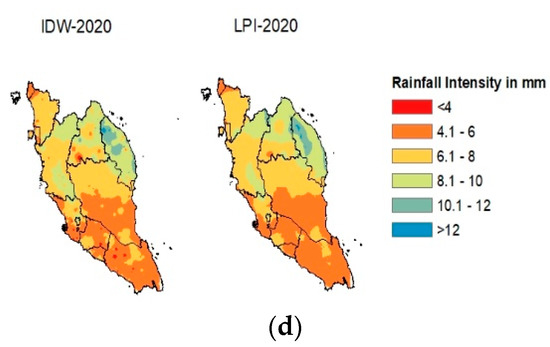 (a) Comparison of Annual Rainfall Intensity in mm using IDW and LPI methods with the ArcGIS Map during 2011–2013. (b) Comparison of Annual Rainfall Intensity in mm using IDW and LPI methods with the ArcGIS Map during 2014–2016. (c) Comparison of Annual Rainfall Intensity in mm using IDW and LPI methods with the ArcGIS Map during 2017–2019. (d) Comparison of Annual Rainfall Intensity in mm using IDW and LPI methods with the ArcGIS Map in 2020.