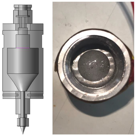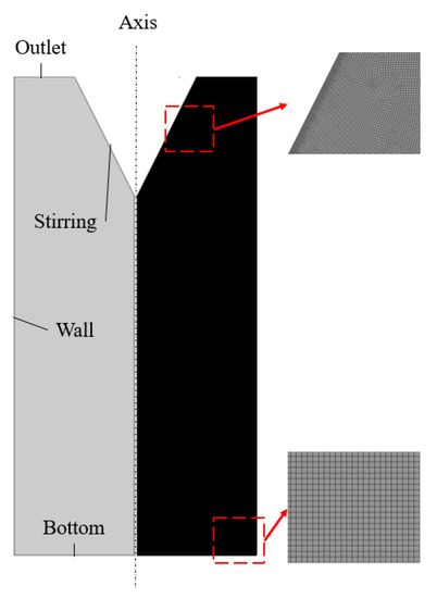 The powdered plastic was placed inside the barrel, preheated, and melted through the heater on the wall surface. Then, the heat source was transferred inward from the wall surface, which coated the air that had not been diffused in the particle. In the axisymmetric simulation, a two-dimensional geometric model is shown in Figure 2. The height of the bucket was 0.04 m, the symmetrical width was 0.01 m, and the depth of the conical agitator was 0.01 m. The rotation radius was 0.0025, 0.005, and 0.0075 m, respectively.