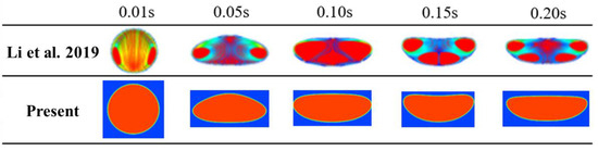 Before the numerical simulation, we verified the correctness of selecting the VOF model for calculation. In Figure 3, Li et al. [11] studied the rising deformation of bubbles in glycerol. The bubbles in glycerol showed a change of 61.23% from the sphere to the ellipse gradually. The fluid properties in this study refer to the rising process of bubbles under 100% glycerol, in which the viscosity of 100% glycerol was , which is a thousand times higher than that of water.