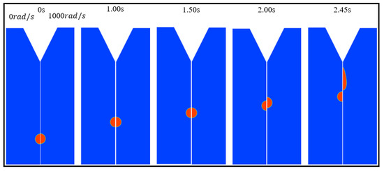High viscous forces slow the fluid flow, which, in turn, causes the bubbles to rise slowly. The most direct way is to make the fluid produce forced convection to guide the bubble to accelerate upward. At first, the bubbles were not significantly affected because they were at a certain distance from the cone agitator and maintained a steady rise. As shown in Figure 4, the position map of the bubbles with and without rotation speeds are compared at different times. When the air bubbles entered the influence range of the agitator, the distance between the rotating cone and the air bubbles at no rotation speed gradually increased.