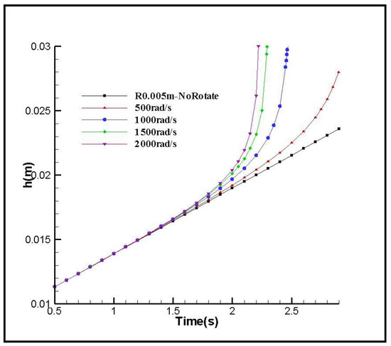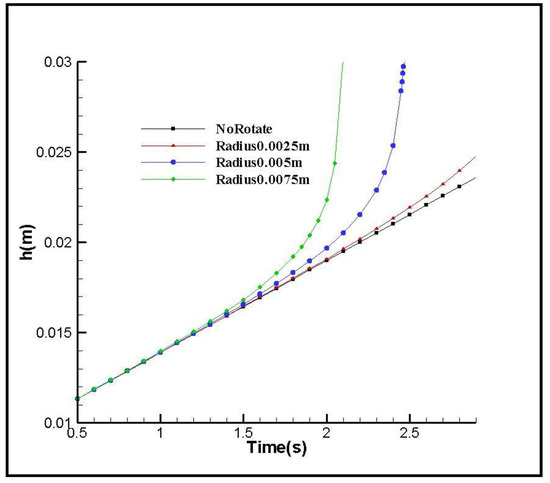 In the case of different rotational speeds, the effect of convection on the air bubbles increased. As shown in Figure 5, the horizontal axis and the vertical axis, represented the position of the bubbles, which rose at different times. When the stirring radius of the bubbles was 5 mm, the positions of the bubbles were at different speeds. As the rotation speed increased, this effect became obvious, but the height of the bubbles rose only in the later stage. This was because the influence range of stirring was still limited by the viscosity. Therefore, when the bubbles rose to the influence range obvious effect, the distance that the bubbles moved in 2 s and 2000 rad/s increased by 7.3% compared with no rotation speed under the action of increasing the rotation speed. With the increase in the rotation effect, it increased to 13% at 2.2 s. The increase in the rotational speed had the effect of increasing the bubbles.