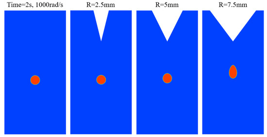 At a fixed rotational speed, different rotation radius changes took place. As shown in Figure 6, under the rotation speed of 1000 rad/s and the influence of a different radius, the position of bubbles at each time varied. At the minimum rotation radius of 0.0025 m (2.5 mm), the convection effect caused by the rotation radius was small, and the curve observed on the ascent height map was closer to that without rotation. In the observation at 2 s, when the rotation radius of the bubble increased, the rotation radius of the bubble increased to 0.0075 m (7.5 mm), and the distance that the bubble moved was 13.4% higher than that of the bubble without rotation. Figure 7 shows that the bubbles rose under the influence of a different stirring radius at 2 s.