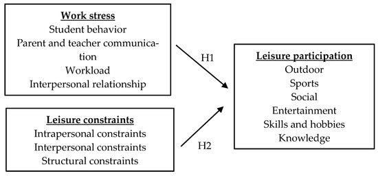 Chi [1] points out that teachers use leisure participation to relieve stress, improve interpersonal relationships, increase work efficiency, and achieve self-realization when faced with work stress. Wu and Liu [2] found that the overall work stress of primary school teachers in the greater Taipei area had different correlations for different leisure activities. Hsu et al. [3] found a positive correlation between work stress and leisure participation. The previous results showed that work stress and leisure participation affect each other. Huang et al. [4] found that the barriers to participation in leisure activities of junior high school teachers have intrapersonal and structural constraints. Ho [5] also found that the leisure constraint of Taiwanese teachers was positively correlated with leisure participation. Thus, work stress, leisure participation, and leisure constraints interact with each other.