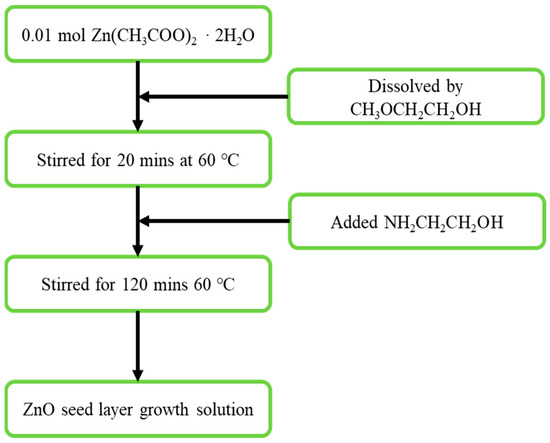 Subsequently, 0.01 mol of Zn(CH3COO)2·2H2O and appropriate amounts of CH3OCH2CH2OH were fully stirred at 60 °C for 20 min; then, NH2CH2CH2OH was slowly added as a stabilizer for the reaction, and after stirring at the same temperature for 2 h, the solution was aged at 25 °C for 24 h. The preparation steps of the seed layer growth solution are shown in Figure 1. A seed layer was prepared using a spin coater; spin-coating was performed at 3000 rpm for 30 s; and then soft-baking was performed. The process was repeated 3 times to ensure that the seed layer was successfully attached to the silicon substrate, and finally placed in a high-temperature quartz furnace tube for annealing at 500 °C for 2 h.