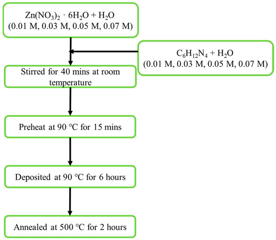 The zinc oxide nanorod growth solution used in the liquid deposition method was prepared by mixing Zn(NO3)2 · 6H2O and C6H12N4 (HMT). First, an appropriate amount of Zn(NO3)2 · 6H2O was stirred with deionized water for 20 min. HMT was stirred with deionized water at the same time. Then, the mixed growth solution was placed in a constant-temperature water bath for 20 min at 90 °C to preheat; then, the silicon substrate with the seed layer was completely deposited in the growth solution for 6 h. After deposition, the samples were taken out and cleaned with deionized water, and the chemical reaction was terminated. After drying with N2, the deposited zinc oxide nanorods were annealed at 500 °C for 2 h in a high-temperature quartz furnace tube with air. Finally, the annealed samples were subjected to surface analysis and material composition detection. The preparation steps of the NR layer growth solution are shown in Figure 2.