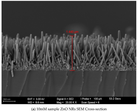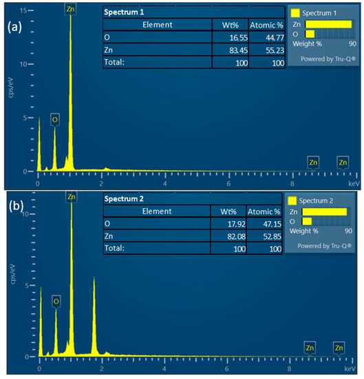 According to the EDS composition analysis results, it can be determined that the nanorods in those samples were composed of Zn atoms and O atoms. The proportion of O atoms in the ZnO nanorod sample accounted for 44.77%, and the proportion of Zn atoms accounted for 55.23%, as shown in Figure 3a. The proportion of O atoms in the ZnO nanorod sample accounted for 47.15%, and the proportion of Zn atoms accounted for 52.85%, as shown in Figure 3b. According to the above results, the ratio of oxygen atoms to zinc atoms changed with the concentration of the growth solution.
