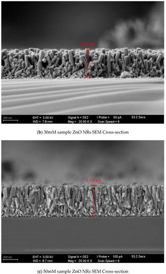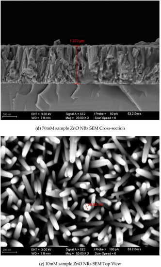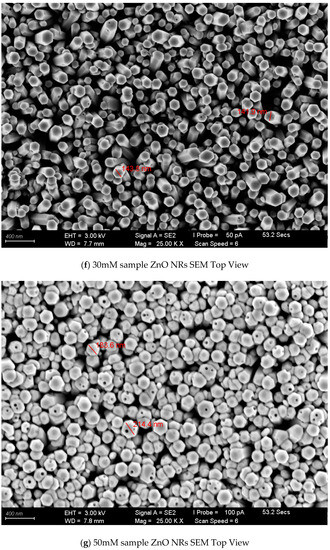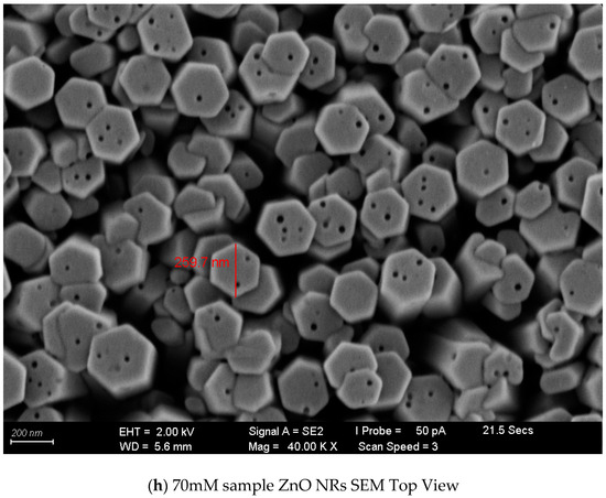 Figure 4a–h show the SEM images of ZnO NRs under different concentrations of growth solution. The reason why the liquid-phase deposition method can grow ZnO nanorods is due to the higher surface energy of zinc oxide along the [0001] direction, which will have a higher growth rate. Figure 4a–d show high-magnification images (magnification 20 K) of samples with concentrations of 10, 30, 50, and 70 mM, respectively; Figure 4e–h are the top views of samples with corresponding concentrations. The image in Figure 4 shows that all grown ZnO nanorods were also in the shape of hexagonal columns, and most of the ZnO nanorods grew vertically upward. The column diameters of the nanorods of zinc oxide were 90, 141, 214, and 259 nm, respectively. This shows that the column diameter of the grown nanorods of zinc oxide increased when the concentration of the growth solution increased. The higher the concentration of the growth solution, the faster the growth rate in the [0001] direction. Many small pores can be observed from the surface of the sample, which is likely to be caused by the high-temperature gasification of acetate ions and intermediate reactants in the sample during the annealing process. The specific surface area of the meter column is beneficial for photocatalysis.