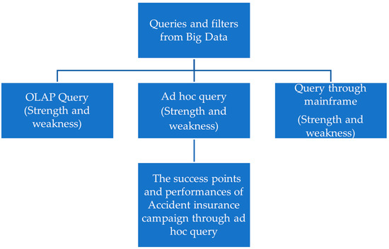 There are many approaches to consider for customer relationship management databases, including ad hoc queries, OLAP queries, and general queries using mainframe systems. A general query is the original approach used to retrieve customer and policy information before the construction of CRM. Employees of insurance companies need to prepare the system requirement documents and send them out to the information and technology department for system program development and permission. An ad hoc query is a one-time or specific query performed in real time to retrieve specific information from big data. Users need to write SQL or related programs to filter data from the database [1,2,3].