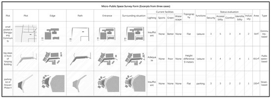 Figure 1). The micro-public spaces were classified into “community-based”, “street-based”, and “public space-based” spaces based on the interview and evaluation results. As a result, special drawings using LSV were drawn (