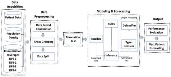 Regarding the method used herein to predict the number of diphtheria cases, thus far, it has rarely been used specifically to research numbers of diphtheria cases; very few alternative methods have been proposed. Past research has proposed using the radial basis function network method to predict the number of diphtheria cases, but the best model is said to involve only the number of cases in the previous period [9]. This is somewhat different from the recent findings previously mentioned. For this reason, in this study, we will forecast the number of cases using a time series approach. The method used in forecasting is the type-2 fuzzy logic systems method. This method is also considered excellent in dealing with complex situations [11,12], and has been widely used for forecasting in various fields. In previous research, the type-2 fuzzy model has been compared to the artificial neural network model and the type-1 fuzzy logic systems model in forecasting coal production capacity; the type-2 fuzzy logic systems model was considered better in terms of stability and consistency [11]. Other studies have shown a low number of errors in prediction when using a type-2 fuzzy method. Prediction of clinical data using type-1 fuzzy and type-2 fuzzy models was carried out in [13]. The study [13] stated that forecasting results produced using the type-2 fuzzy model were superior to those of the type-1 fuzzy model. Currently, there are many applications of the fuzzy type-2 model, including decision-making [11], pattern recognition, classification, and control [12]. However, to the best of the author’s knowledge, until now, there has still only been occasional use of the fuzzy type-2 model for forecasting time series data, particularly cases related to the spread of disease. With that in mind, this study uses a type-2 fuzzy model to forecast numbers of diphtheria cases.