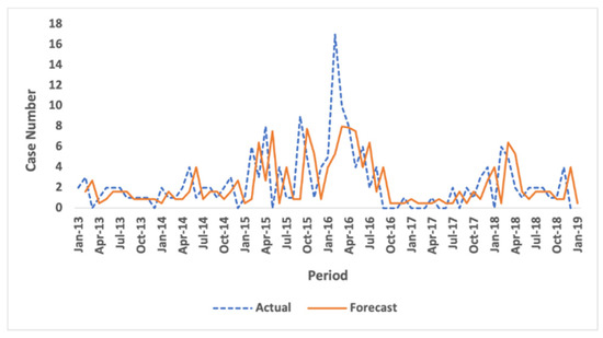 Figure 2 shows the results of testing the model on data from other cities/districts. The trial results of the Surabaya city model using Blitar data graphs show forecast results that follow a pattern. However, the graph seems to shift. Within the Blitar data, the trend of increasing in the mid-period is not captured in the forecast results. Both of these trends occur because of the combination of basic rules used in the model.