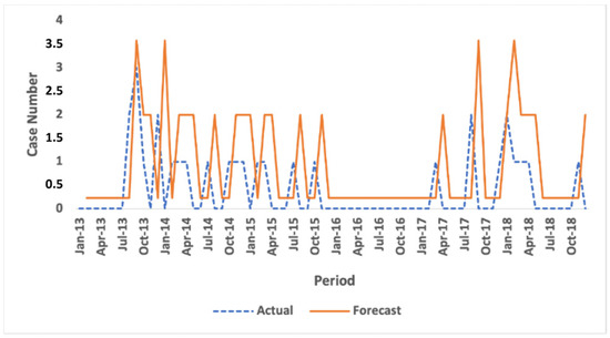 After we know how the model performs against other data, we may forecast the case numbers for the next several periods. The forecasting results for the next several periods using model A.3 in the Malang region are shown in Figure 5. The future forecasting results for the Malang regency show a straight graph with the same value, without any up or down pattern. This is due to the rules used in the model.