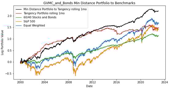Now, with the return of the minimum distance portfolio to the forecasted tangency portfolio, we can find the weights by performing mean–variance optimization at this return. Figure 1 provides a visual of the minimum distance portfolio.