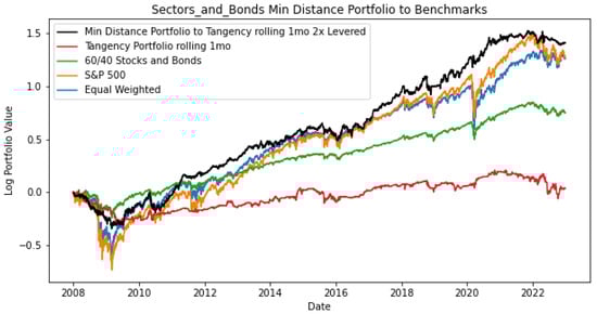 For the first set of assets, the online VARX was initially trained on 1990–1999 data, and the portfolio returns were measured out-of-sample 2000–2022. The second set was trained on 1999–2007 data, and the portfolio returns were measured out-of-sample 2008–2022. We measured the performance of our proposed model against four benchmarks: The Tangency Portfolio with a 1-month rolling window, the equal-weighed portfolio, the S&P 500 total return, and the 60/40 stock and bonds portfolio (60% S&P 500 and 40% FPNIX). Figure 2 and Figure 3 show that the proposed model (black line) outperforms all the benchmarks in terms of return and volatility. Across all years, the proposed model is able to provide consistent returns, while suffering low drawdown during crashes, like in 2008 and 2020. The proposed model in Figure 3 is 2-levered to provide a better visual comparison, as the proposed model had higher Sharpe than the benchmarks, but lower return.