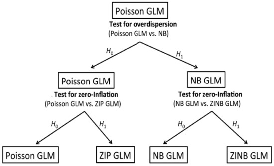 Poisson and negative binomial regression models (Figure 1) are part of the family of Generalized Linear Models that are commonly used in epidemiological studies [8]. These models are widely used to model disease incidence data with a non-negative integer, no upper limit, and highly skewed distribution. Otherwise, a zero-inflated Poisson (ZIP) model, a zero-inflated negative binomial (ZINB), or a negative binomial need to be used [9].