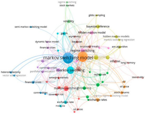 The Markov Switching model of Hamilton [11], also known as the regime-switching model, is one of the most popular nonlinear time series. This model involves multiple equations that can characterize the time series behavior in different regimes. By permitting switching between these structures, this model is able to capture more complex dynamic patterns. This model and its variants have been widely applied [12,13]. The following network mapping [14] summarized the co-occurrence of author’s keywords when using the Markov Switching model (Figure 3).
