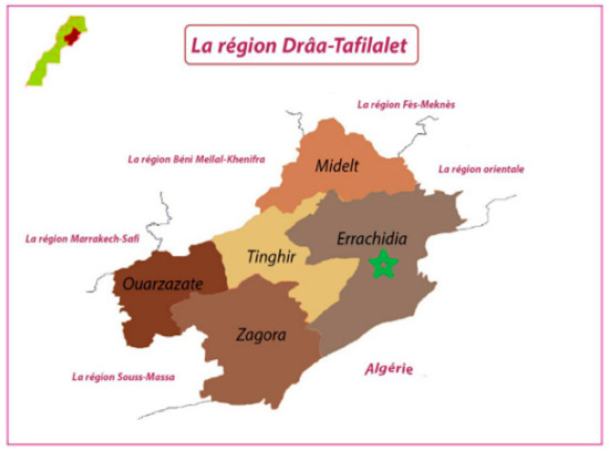 Errachidia province is located in the Ziz Ghris Valley in the south-east of Morocco (Figure 4), including the Saharan areas, plains, and highlands at an altitude above 1900 m and covering a surface of 46,000 km2. Errachidia has an arid climate with temperatures between −4 °C and 48 °C, with large daily and seasonal temperature variations. The annual mean temperature is 21 °C. Rainfall is scarce and usually occurs between February and March. The annual total precipitation is 134.64 mm [15].