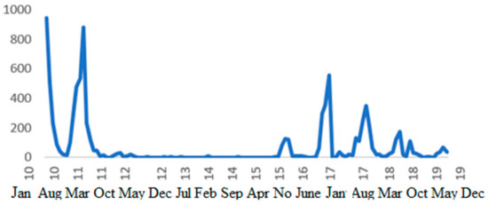 The analysis of collected data shows that Errachidia province recorded 8487 cases of cutaneous leishmaniasis between 2010 and 2019 (Figure 5). It can be observed from Figure 5 that the monthly CL incidence peaked between 2010 and 2011, declined between 2011 and 2016, and rose around the end of 2016 to 2018. In addition, the number of CL cases had seasonal fluctuations. Most cases were recorded in the months of November, December, and January. The trend starts to increase in October, with high peaks in December and January, and declines until February. A steady-state period is observed until September.