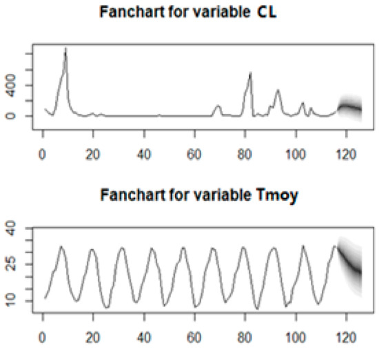 The p-value of the Granger causality test is equal to 0.0023 < 5%, meaning that we can reject the null hypothesis. Hence, “Tmoy” is considered a pertinent feature (risk factor) when predicting the “CL” variable. As displayed in Figure 7, a good performance is shown, in terms of predictions obtained from VAR(1).
