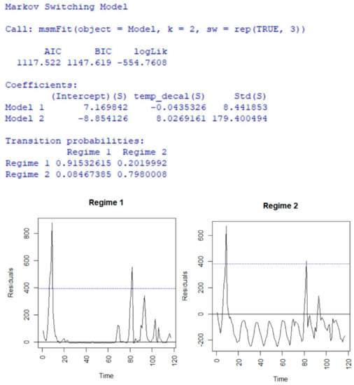 The following figure (Figure 8) provides results about the Markov Switching model fitting with the estimation of regime 1 and regime 2. However, based on the AIC and residuals diagnosis, the VAR(1) performs better than the Markov Switching model.