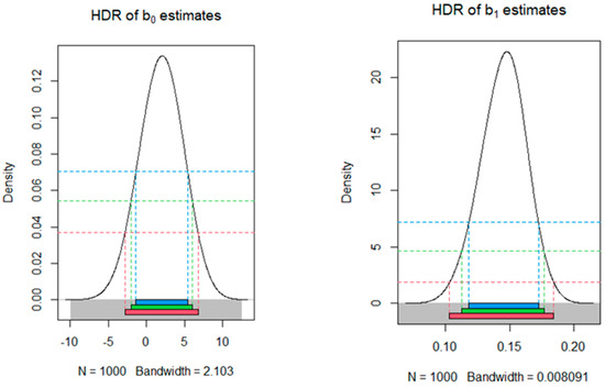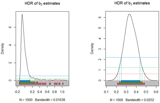 Looking at the highest density region (HDR) graphs below, which represent the model with 994 observations, we can see that the constant () in Figure 1 and the coefficient in Figure 2 are not statistically significant, as all confidence intervals (at confidence levels of 90%, 95%, and 99%) include zero. On the other hand, coefficients and can be considered statistically significant, as the corresponding confidence intervals do not include zero at any confidence level tested.