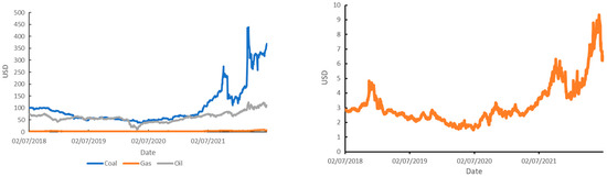 Figure 3 shows the trend in the price of CO2 emissions. Figure 4 (on the left) shows trends in the price of coal, the price of natural gas, and the price of Brent oil in the period under study. Figure 4 (on the right) highlights only the price of natural gas, because it is not clear in the figure on the left.