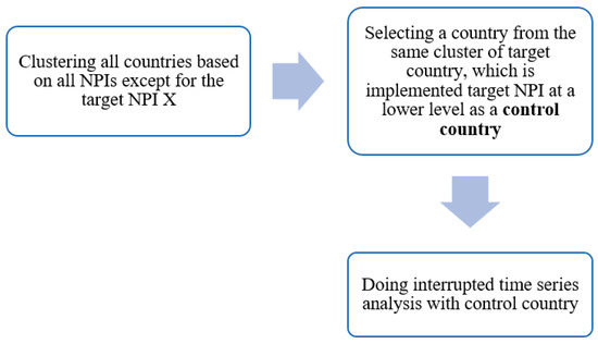 First, we clustered all countries with their data based on all studied NPIs except for NPI X. The K-Means clustering algorithm [12] was used for this purpose. This identifies which countries are in the same cluster as the target country. Among these countries, we determined pairs of countries that implemented NPI X at different levels. We then looked at the countries paired with the target country and selected the country which could work as a control group. A control country must have implemented NPI X at zero or lower levels for a period before and after NPI X implementation level changes in the target country. After selecting the control country estimate, we could use interrupted time series with counterfactual analysis for the control group to determine the effectiveness of NPI X. The methodology’s steps are illustrated in Figure 1.