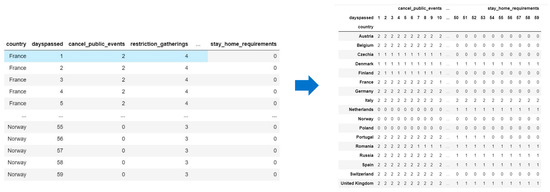 We clustered countries based on NPIs mentioned in the Materials section, except for school closure. Since the data related to each NPI are time series data during the second wave of COVID-19, the problem was clustering time series data. One of the methods for clustering time series data is considering each time point as a data column (feature) for clustering. Figure 2 illustrates how the data frame was transformed for time series clustering purposes. We considered just the first 60 days of the second wave because the performance of K-Means depends on the number of features, and it cannot perform well when the number of features is increased [13]. Moreover, the minimum duration for the second COVID-19 wave was 65 days in Poland.