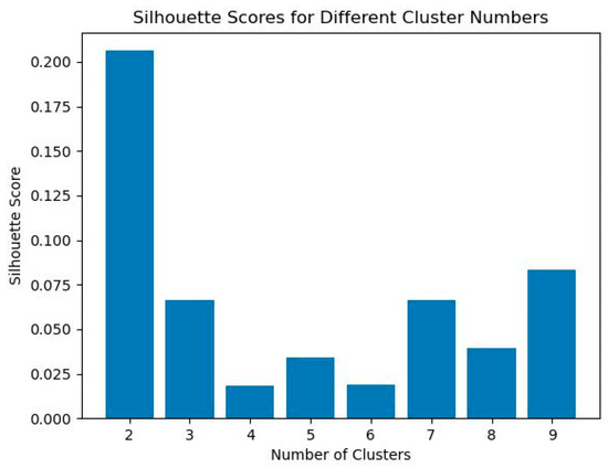 One of the limitations of K-Means clustering is that the number of clusters (K) is not determined. Several ways exist to determine the number of clusters, like elbow law or Silhouette score. Here, we used Silhouette score, which measures how well the items (countries) in one cluster are separated from items (countries) in another cluster. The maximum Silhouette score is one, and it assigns higher values to better clustering results [13]. Figure 3 illustrates the Silhouette metrics for different numbers of clusters. Since we had 17 countries to cluster, the maximum number of clusters was set to 9 because we needed at least one pair of countries in each cluster in order to select the control country. Since K = 2 has the highest Silhouette score, we set the number of clusters at 2.