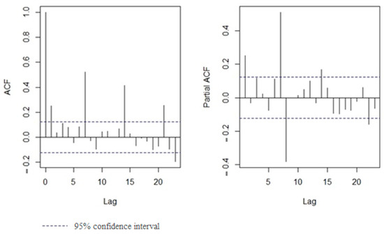 To check for autocorrelation, the auto correlation function (ACF) plot and partial ACF (PACF) plot of the OLS model residuals are illustrated in Figure 5. We considered the maximum 23-day possible lag. Since ACF shows exponential decay, we utilized autoregression (AR). AR means that the error term is related to the error term in previous periods. Since PACF does not show an exponential decay, considering the moving average was not necessary. We examined the PACF plot to determine the AR order and pick the highest violation from the 95% two-way confidence interval (dashed lines). As the PACF for number 7 was larger, AR = 7 was considered for the model.