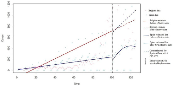 In Figure 6, the blue line is the Spain data, and the red line is the Belgium data (control group). The dashed blue line shows the counterfactual for Spain based on the control group data (without the time-squared term). The blue line after the vertical black dashed line shows the COVID-19 prevalence after stricter intervention implementation in the target country. As shown in Figure 6, one level stricter school closure decreased the COVID-19 prevalence level and caused a negative trend2.