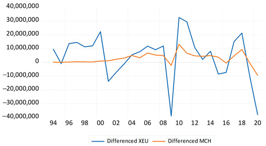 It is evident that both series are non-stationary since they have a trend. In order to estimate a VAR model, it is necessary for the series to be integrated in the same order to be transformed into stationariy; in this particular case, they are I(1). Figure 2 shows the stationarity of the two series after the respective first difference, which was confirmed by augmented Dickey–Fuller [11] and Phillips–Perron [12] tests.