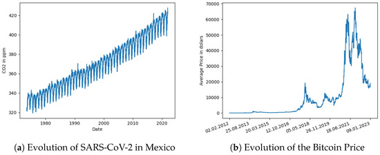 The study focused on six real-world time series, each representing a measurement of a real-world phenomenon. The aim was to examine more complex time series than artificially generated ones. The selected time series displayed a wide range of characteristics, including exponential and moderate growth patterns, general trends, and horizontal patterns. The goal was to evaluate the generalization ability of the proposed methodologies by considering time series with diverse characteristics. Below is a brief description of each of the time series used.
