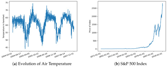 The S&P500 index series (Data was sourced from: https://datahub.io/core/s-and-p-500 (accessed on 11 February 2023)) is a monthly measurement of the value of the S&P500 stock index, which represents the 500 most valuable companies in the United States. It consists of 1768 monthly value data points calculated from 1871 to 2018. The data was normalized for analysis between the range of . Figure 3b shows the evolution of the S&P500 index graphically.
