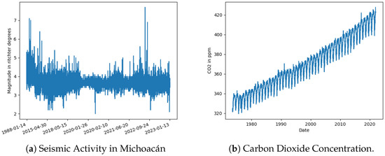 This series comprises seismic activity recorded by the National Seismological System in Michoacán (The time series is available at the following URL: http://www2.ssn.unam.mx:8080/catalogo/ (accessed on 22 January 2023)). The values cover the period from 1988 to 2023. This time series was of interest as the data was not evenly spaced. One possibility was to summarize the data to create an indicator to identify “how active each month was”. However, for our study, the original sampling frequency was maintained. Each event is a numerical value representing its magnitude in Richter scale degrees and consists of 17,500 data points, which were normalized between . Figure 4a graphically depicts these data.