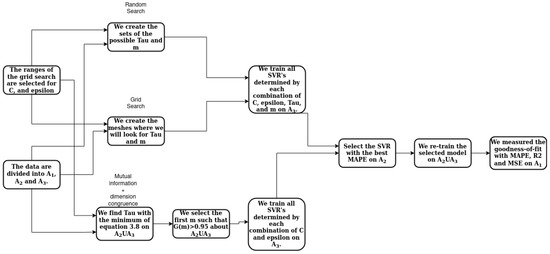 For each of the analyzed time series, the parameters m,, and the parameters C and for the SVR were optimized. Three strategies were used: mutual information + congruence, grid search, and random search. The flow diagram in Figure 5 summarizes the process.