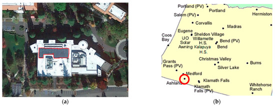 Area of the study experiment. (a) The red line shows the array of a photovoltaic system in Ashland; (b)the red circle show the location of the photovoltaic array has a latitude of 42.19 and a longitude of 122.70 at an altitude of 595 m.