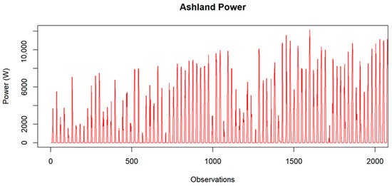 where is an arbitrary day of the year. To calculate the apparent movement of the sun, the latitude of Ashland was incorporated as reference data, which resulted in the global irradiance; later, based on the information from the photovoltaic array, an adjustment was made to the IV curve of the solar panel according to the characteristics of the manufacturer, in such a way that the output power of the system was calculated according to each observation. The clear sky model does not consider specific characteristics of the system or sudden changes of physical origin, such as: system damage, system maintenance, or a physical phenomenon with little anticipation, among others, so one of its main disadvantages is its characterization of ideal conditions of the environment and the system.