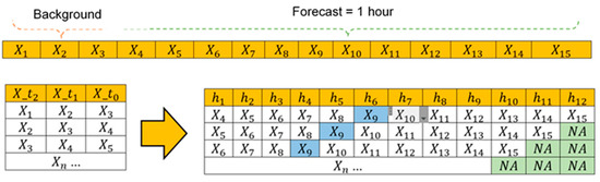 Figure 4 also shows that, as the displacement of the dimensions given by is advanced, i.e., , the moment will come when there will be no observations that can continue to return results for the last forecasted observations and will be marked as NA (absence of data).