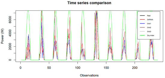 Figure 4 shows a comparison of the models of neural networks with different architectures in their configuration, SARIMA, and clear sky index with respect to the actual observations of the photovoltaic array. The observations estimated with each model were obtained as a product time series with the same cyclical pattern that corresponds to the generation of electrical energy from the solar resource. The time of the clear sky index model is the one with the greatest variation compared to the actual observations. Figure 4 shows that the network 1, which has a network architecture and configuration, presents a fluctuation closer to reality.