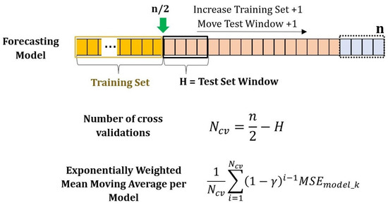 Due to the time dependency between the out-of-sample error measures of the cross-validation tests, a simple average of the resulting errors generates a biased indicator for choosing the best-performing model. Therefore, an exponential weighting approach can be applied to circumvent this problem [14]. The Exponentially Weighted Moving Average (EWMA) is a weighted average of all current and previous forecast errors, whose weights decrease geometrically with the “age” of the forecast error [4]. Therefore, the lowest resulting EWMA MSE is then used to select the best-performing model.